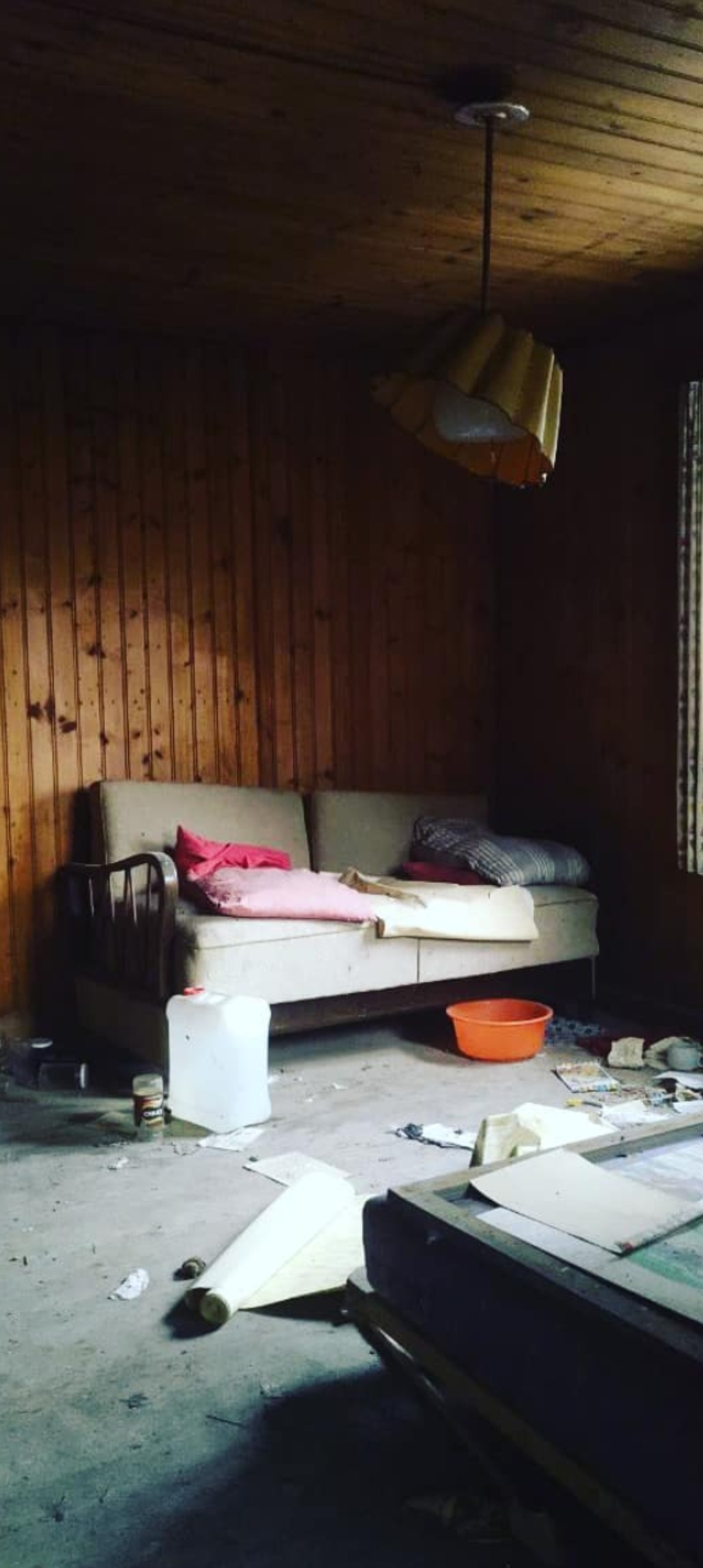 Als wir den gewundenen Weg weitergehen, stoßen wir jedoch auf etwas, mit dem ich hier nicht gerechnet hatte: Zu unserer Rechten ragt der Giebel eines windschiefen Holzhauses aus dem braungrünen Wirrwarr undurchdringlichen Dickichts. Dass ich ausgerechnet heute auf dieses eingefallene Holzdach stoße ist für mich wie ein Geschenk, genau das besondere Abenteuer, das ich erleben wollte. Also biege ich die dornigen Zweige auseinander und betrete moosigen Boden, der unter meinem Gewicht nachgibt. Zwischen Glasscherben und rostigen Fassringen bahne ich mir meinen Weg an einem verfallenen Mäuerchen entlang, bis ich um die Ecke des Hauses schauen kann und eine marode Holztüre sehe. Ich betrete das kleine Haus und habe das Gefühl in der Kulisse eines Horrorfilmes zu stehen. Ein verblichenes Graffiti an der gegenüberliegenden Wand fordert mich dazu auf, die Augen offen zu halten: „See what i see“ steht am Eingang zum nächsten Zimmer und ich fühle mich plötzlich ziemlich nervös und irgendwie beobachtet. Ich gehe also vorsichtig über knarzende Holzdielen, vorbei an leeren Farbdosen und umgeworfenen Stühlen und luge in den angrenzenden Raum. Natürlich ist dort niemand, das einzige, was ich vorfinde ist noch mehr Unordnung und Verfall. Die Matratze eines alten Bettes hängt schief auf ihrem Lattenrost und der Lampenschirm einer genähten 70er-Jahre Lederlampe erscheint einigermaßen aus der Fassung geraten. Gleichzeitig bemerke ich in diesem Chaos aber auch Details einer längst vergangenen Zeit, die von liebevoller Fürsorge für dieses Häuschen zeugen. An der Wand neben der Tür hängt ein alter Strohhut mit Stoffblume am Hutband, der so gepflegt aussieht, als habe die Besitzerin ihn gerade erst dort hingehängt. Die bunten Vorhänge an den Fenstern sind ordentlich zur Seite geschoben und passen farblich perfekt zu Lampe und Couch. Dieses Haus, das von außen noch so krumm und klein wirkte, erscheint innen als verwinkeltes Labyrinth, in dem sich Zimmer an Zimmer reiht. Nach dem Wohnzimmer betrete ich eine Art Küche, wie ich zumindest aufgrund des alten Herds vermute, der rostig braun an der Wand neben der Tür lehnt. Dieses Haus mit seinen Windungen und Nischen, seinen versteckten Räumen und unerwarteten Funktionen lässt mich ratlos zurück. Wer baut mitten in den Wald solch eine Miniaturversion eines echten Hauses?