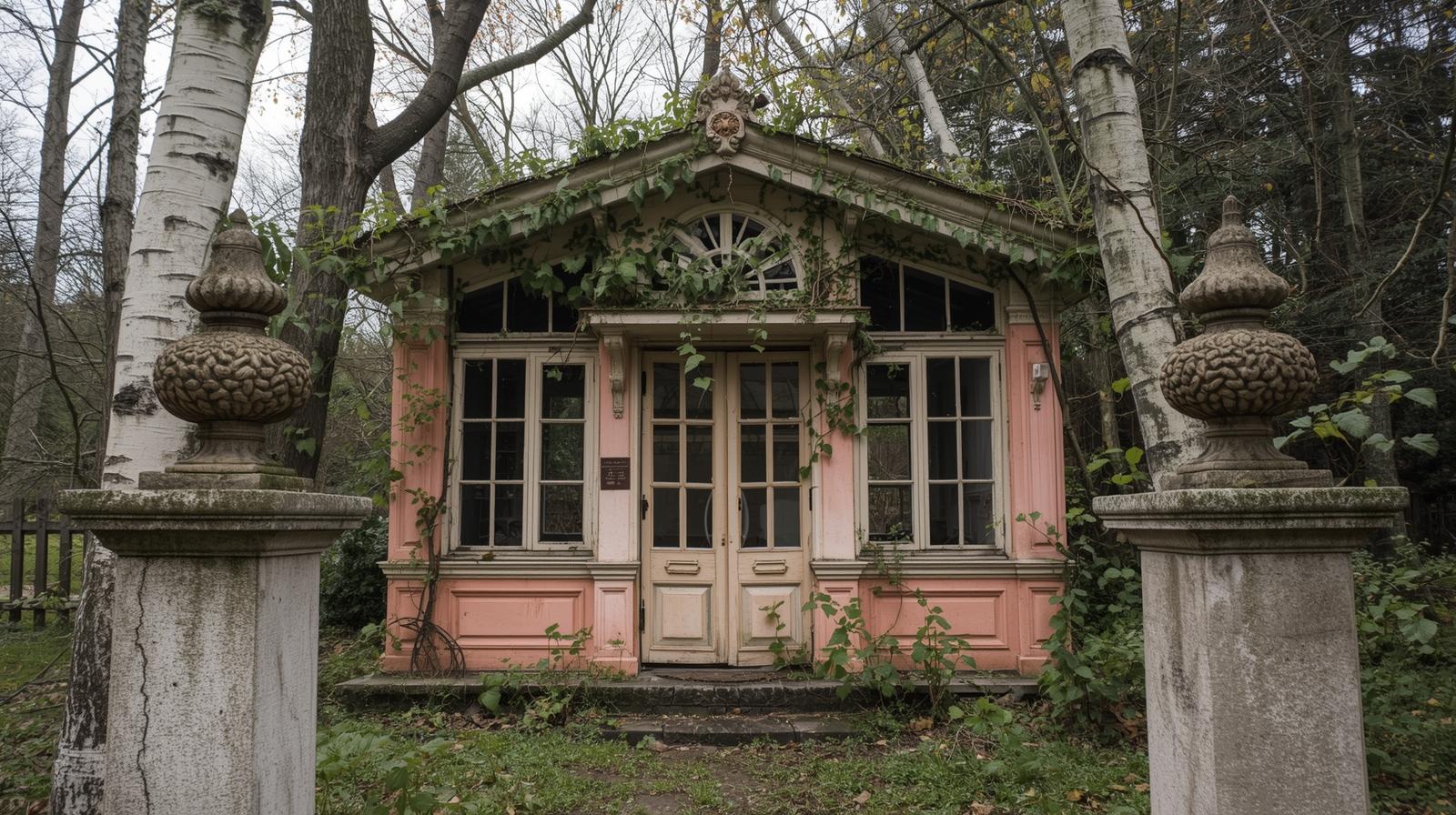 Als ich um die Ecke hinter der alten Eibenhecke biege, sehe ich die Sonne hinter zwei hohen Birken untergehen. Orange und gelb blitzt sie auf und taucht das Haus mit der muschelrosafarbenen Fassade hinter den Birken mit ihren schrägen Strahlen in ein dampfiges Licht. Abrupt bleibe ich stehen. Irgendwie fasziniert mich der Anblick dieses Hauses. Es ist eigentlich nicht wirklich ein Haus, sondern eine kleine Gartenlaube, aber durch die Art, wie es gebaut ist, wirkt es wie eine große Villa. Der Eingang, der mit einem schmiedeeisernen Tor verschlossen ist, wird von zwei Säulen mit gemeißelten Zapfen flankiert, neben denen die beiden Birken stehen, die so wirken, als seien sie mit Bedacht genau an diese Stelle gesetzt worden, um den Eindruck eines prachtvollen Herrenhauses noch zu verstärken. Der Grundstein am Fuß der linken Säule erzählt von der Vergangenheit des Häuschens aus dem Jahr 1923. Ich steige langsam die Treppe zum Eingang des Hauses hoch und erreiche eine Terrasse, deren Bodenfließen von Löwenzahn und anderem Grün aufgebrochen sind. Auch die Fließen auf der Schwelle des Hauses sind von feinen Rissen durchzogen, wodurch die Darstellungen der tanzenden Flappergirls fast noch zarter und filigraner wirken. Mit einem kleinen Sprung, um die bunten Tanzbilder nicht weiter zu beschädigen hüpfe ich ins Haus und erlebe eine kleine Enttäuschung. Nach den vielen Details, die vor meinem geistigen Auge Bilder von funkelnden Sommernächten, durchgetanzten Schuhen und schnellem Swing entstehen ließen, erwartet mich ein nahezu leerer Raum. Statt einem angelaufenen Kronleuchter finde ich nur noch eine leere Badewanne und drei Stühle vor. Einzig in den Scherben eines großen Fensters, die den Boden gegenüber des verlassenen Stuhlkreises bedecken, finde ich das Funkeln meiner Vorstellung wieder. Als ich gerade dabei bin das Haus zu verlassen, bemerke ich Überreste bunter Tapeten. Unter einer perlweißglänzenden Raufasertapete spitzt das orangerote Muster einer geometrischen Fließtapete hervor. Schicht um Schicht schält sich die Vergangenheit des Hauses heraus, zeigt sich die Chronologie seines Lebens. Auf dem Grund dieses Skeletts finde ich eine Schicht alter Zeitungen, mit denen die nackte Wand verkleidet worden zu sein scheint. Neuigkeiten von 1920. Am liebsten würde ich vorsichtig die obersten Tapetenschichten abziehen und die dahinterliegenden Botschaften freilegen. Das Haus lesen, um zu wissen, was die Welt bewegte, als der Raum sich noch im Schwung der goldenen 20er drehte.